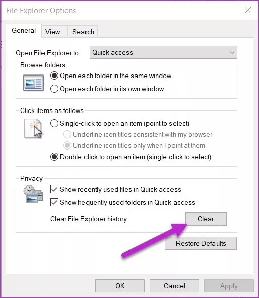 در این پنجره، در بخش Privacy تنها کافیست روی گزینه Clear که روبهروی عبارت Clear File Explorer history قرار گرفته، کلیک کنید.
