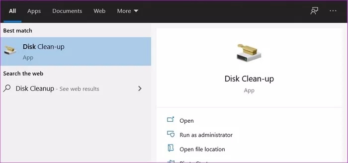 برای پاک کردن فضا، عبارت Disk Cleanup را در منوی استارت جستجو کرده و سپس از منو، درایو C را انتخاب کنید.