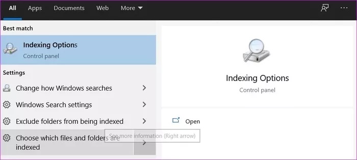 برای چنین کاری، عبارت Indexing Options را جستجو کنید.