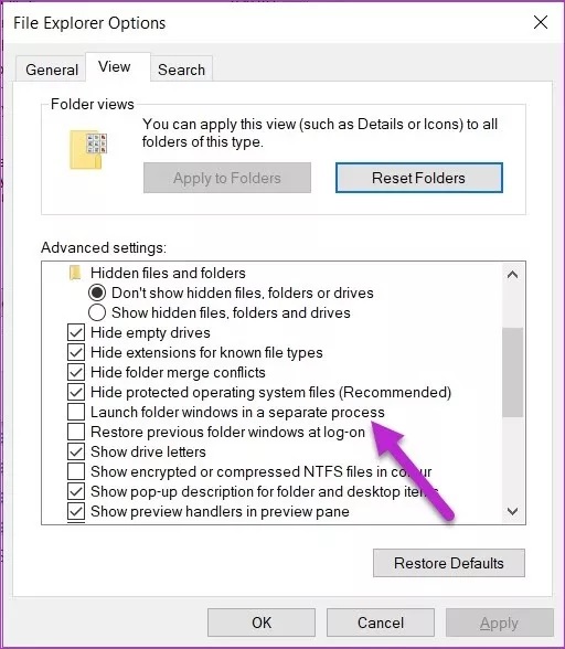 اگرچه مایکروسافت ادعا میکند که چنین ویژگی بطور پیش فرض روی اکثر سیستمهای مجهز به ویندوز ۱۰ وجود دارد، اما بد نیست خودتان هم آن را بررسی کنید. برای شروع کار، FIle Explorer Options را جستجو کنید. در پنجره آن به تب View بروید و گزینه Launch Folder windows in seperate process را فعال کنید.