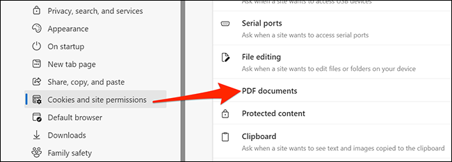 در بخش Cookies and site permissions باید PDF documents را انتخاب نمایید.