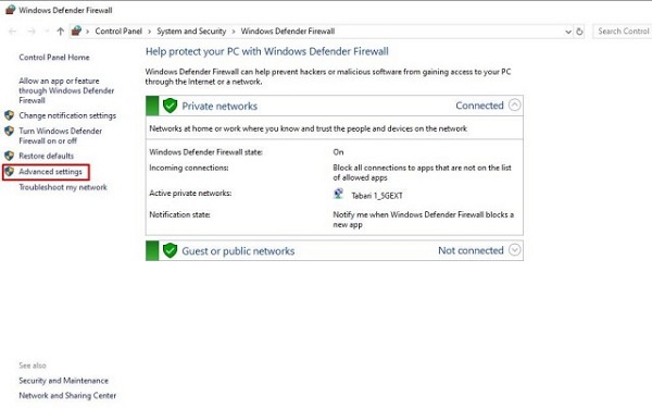 نحوه قطع اینترنت در ویندوز ۱۰ کار چندان سختی نیست؛ کافیست که عبارت Windows Defender Firewall را در نوار جستجوی ویندوز ۱۰ تایپ کنید و روی اولین نتیجه ظاهر شده کلیک کنید. در سمت چپ صفحه؛ Advanced Settings را انتخاب کنید.