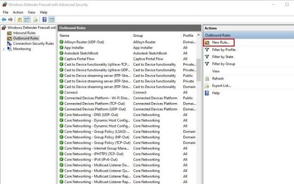 بعد از باز شدن پنجره Advanced Security در سمت چپ Outbound Rules را انتخاب کنید. حالا کافیست که New Rule را کلیک کنید.