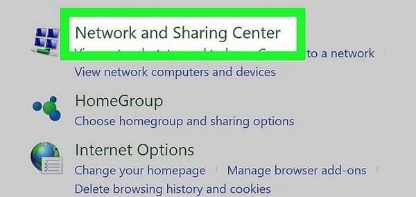 برای عدم دسترسی به اینترنت در ویندوز ۷ باز هم کنترل پنل را باز کنید. Network and Sharing Center را انتخاب کنید. اگر از دسته بندی ها استفاده می کنید در زیر Network and Internet روی Network settings, network adapters کلیک کنید و بعد View network status and tasks را انتخاب کنید. اما اگر گزینه ها را بر اساس آیکن مرتب کرده اید، باید Network and Sharing Center را کلیک کنید.