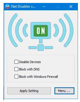 اگر دوست ندارید مراحل زیادی را به صورت دستی انجام دهید؛ می توانید با استفاده از Net Disabler به طور موقت دسترسی به اینترنت را قطع کنید. Net Disabler نرم افزار رایگانی است که برای ویندوز ۳۲ و ۶۴ بیتی در دسترس است. در هنگام راه اندازی؛ این برنامه ۳ گزینه را به شما نشان می دهد و به شما کمک می کند تا اینترنت خود را غیر فعال کنید. هر یک از این گزینه ها را که می خواهید؛ انتخاب کنید و بعد Apply Settings را کلیک کنید. برای بازیابی دسترسی به اینترنت؛ کافیست که تیک گزینه ای که انتخاب کرده اید را بردارید و دکمه Apply Setting را انتخاب کنید.